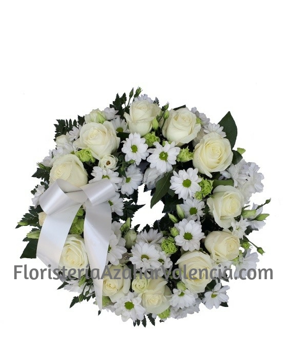 Bonita Corona Funeraria Pequeña para difuntos de tu floristería de Valencia. Está realizada con un aro de 30 cm. de diámetro, y confeccionada con 12 rosas, 6 lisiamthums, 6 varas de margaritas, verdes variados y cinta funeraria. Pese a su tamaño, esta corona funeraria puede ser perfecta en determinadas ocasiones. Las Flores Blancas para dar Condolencias de esta corona para difuntos de son de primera calidad. Están suministradas por nuestros proveedores nacionales e internacionales de siempre. Si quiere enviar flores al tanatorio ha de saber que somos floristas profesionales, especialistas en el sector funerario de flores. Así que esta Corona Funeraria será siempre especialmente bonita.