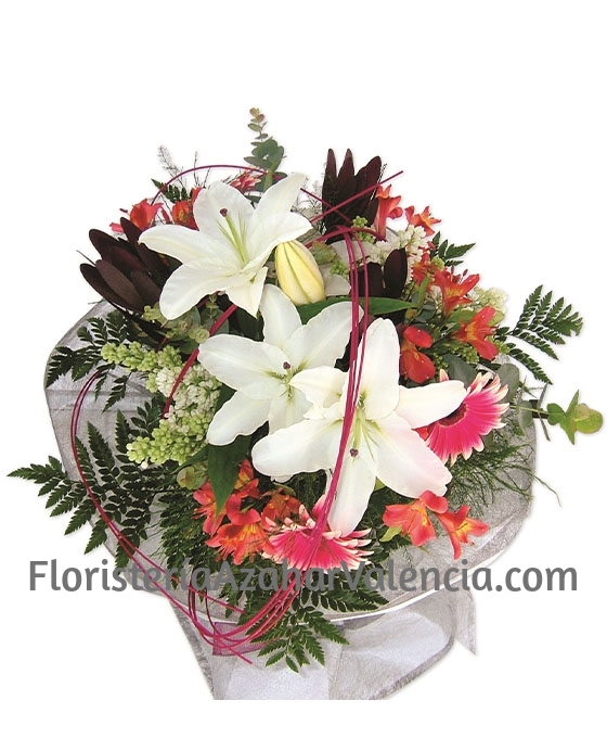 Es perfecto, este Bouquet Flores Suecia, de colores dulces y suaves, capaz de captar todos los sentimientos. Compuesto por flores variadas como: lilium blanco, rosas rosadas y gerberas de color rosado. Hacen de este conjunto, el ramo de flores de regalo perfecto, para una ocasión ideal. Seguro que sabe usted sabe cuando es el momento de hacer este bonito regalo de flores. En la floristería online de Floristería Azahar ofrecemos. un servicio de envío de flores con la compra de cualquiera de nuestras composiciones florales. Si quieres comprar flores online y estás buscando una floristería online de entre las floristerías de Valencia, Floristería Azahar te ofrece los mejores ramos de flores para regalar.