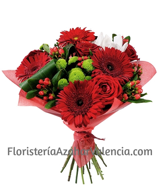 Precioso Ramo Flores Londres, cálido, alegre. Nuestra floristería online Floristería Azahar, presenta esta bonita composición de regalo, exquisita, compuesta de gerberas de color rojo, margarita de botón verde, hierba de oso, aspidistra, rosas rojas. Un bouquet de flores precioso que podemos enviar al domicilio que se nos indique, para hacer el mejor ramo de flores rojas para regalar. Además, tenemos un servicio de envío de flores urgentes con la compra de cualquier ramo de flores para regalar.