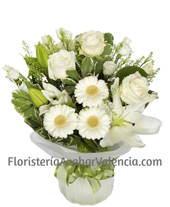 Precioso este Ramo Flores París, confeccionado con preciosas flores como son las rosas, el lilium, el lisianthum y las gerberas, en tonos blancos y decorado con elegantes verdes que realzan todavía más la belleza de las flores blancas. Sin duda, un ramo de flores blancas de regalo, especial para una ocasión especial, como puede ser dar la bienvenida a un bebé, regalar a una novia, o bien simplemente por el deleite de las flores blancas, muy apreciadas por la dulzura e inocencia que inspiran. Es el regalo perfecto, que sin duda podemos hacer si lo que queremos es alegrar un bonito día. Bonito ramo de flores blancas de regalo que presenta nuestra Floristería Online de Floristería Azahar. En la floristería online de Floristería Azahar ofrecemos un servicio de envío de flores a domicilio con la compra de cualquiera de nuestros arreglos florales. Algo idóneo para las flores blancas para regalar.