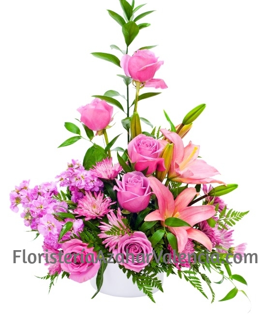 Precioso por sus tonos y muy elegante por sus hermosas flores es este Centro de Rosas y Lilium Rosados. Es un centro de flores de regalo compuesto por algunas de las mejores flores que nos ofrece la naturaleza, como son las rosas rosas para regalar y el lilium, las margaritas, todo ello decorado con hermosos verdes sobre una base de cerámica. En Floristería Azahar, su floristería online, expertos en el arte floral, podemos ayudarle a hacer el regalo perfecto. Haremos llegar a su ser querido, todo el amor y alegría que quiere demostrar con este bonito centro de rosas a domicilio. Sin duda, lo que quiere es hacer el mejor regalo.